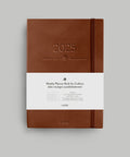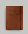 • elegant brown faux leather hardcover with elastic closure and matching ribbon bookmark