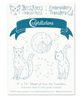 Artist-created iron-on embroidery transfers! Each 9"x12" sheet includes multiple ready-to-use designs that transfer 3-5 times each, with complete instructions and online tutorial access. About The Designs This iron-on transfer sheet includes these designs: Celestial Cat This bestselling cosmic cat features stars, perfect for astronomy enthusiasts, zodiac collectors, witchcraft practitioners, and space-themed room decor. Our most popular celestial feline design! Cosmic Catnap Magical sleeping cat with stars. Perfect for astronomers, witchcraft practitioners, and celestial decor. Galactic Goodbye Kitty cat constellation with humorous star placement. Perfect for astronomy lovers, astrologers, galaxy decor, and snarky gifts.
