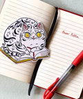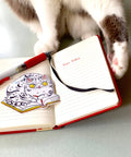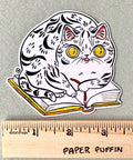 A cat sitting on a favorite book, helping you keep your spot. + size:3.3" x 3.4” + permanent adhesive glossy vinyl sticker with solid peel backing + scratch and weather resistant material, PVC free + packaged and shipped flat All work and photos ©PAPER PUFFIN Art by. K.CARLSON