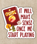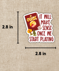 Embrace the learning curve with this ‘It Will Make Sense Once We Start Playing’ sticker! Perfect for board game fans who know the struggle of complex rules when playing a new game, this vinyl sticker brings humor to any game night. * Sticker Details * - 2.8x2.8 in. sticker - Vinyl printed stickers - fast and easy bubble-free application - Waterproof & Weatherproof - dishwasher safe, can be placed on cars and water bottles - Removes with little to no residue, any residue can be easily removed with hand sanitizer or rubbing alcohol