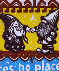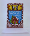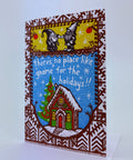 Warm and welcoming ginger bread house with gnomes. Happy holiday fist bump for the best decorated house on the block. Home is where the gnome is. OK, I'll leave it at that. Letterpressed in multiple overlapping colors. Blank inside for your own message. 6 1/4"x4 1/4" card with matching standard A6 square flap envelope in clear cello sleeve.