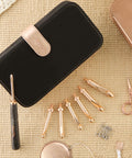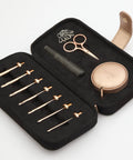 The Oasis Starter Set is ideal for beginners and seasoned crocheters. Catering to the needs of every crocheter, the set features 7 interchangeable crochet hooks in sizes 2.0 - 5.0mm. The versatile metal crochet hooks in the shade of rose gold snugly fit on the grey onyx wooden handle. The hooks and handle, accompanied by a handy measuring tape, 10 metal locking stitch markers, and scissors, are neatly arranged in a black (coal) fabric carrying case, ideal for travel and storage.