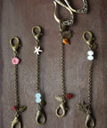 Use these unique handcrafted chains to attach scissors or other accessories to a knitting bag or purse so they are always within reach! These charming chains are made with Czech and crystal glass beads as well as antiqued bronze charms representing each season. From flowers in bloom for spring, seashells for summer, autumn leaves, and cozy winter snowflake, there is a chain for every time of year!