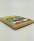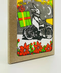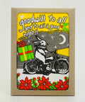 Special holiday delivery. Rabbit to the rescue. Vintage motorcycle rider under the moon & stars. Box set 6 cards and envelopes in custom chipboard box. Plastic free packaging. Letterpressed in multiple overlapping colors. Blank inside for your own message. Includes six 6 1/4" x 4 1/4" cards with six matching standard A6 square flap envelope