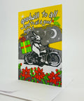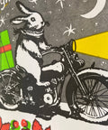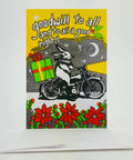 Special holiday delivery. Rabbit to the rescue. Vintage motorcycle rider under the moon & stars. Letterpressed in multiple overlapping colors. Blank inside for your own message. 6 1/4"x4 1/4" card with matching standard A6 square flap envelope.