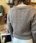 Dark Grey modeled sweater images from BabyCocktails Mastiha Ravelry Listing.